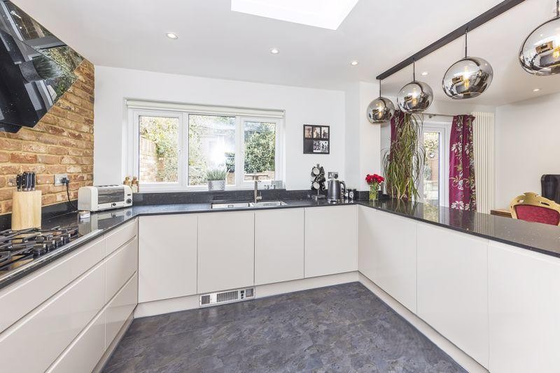 Using Wren J Pull kitchen in Cashmere, slate effect LVT floor and tall radiator to make the most of the space and brick slip wall to give a continuation of the external garden wall inside. Skylight in ceiling to maximise the light from the flatroof above.
